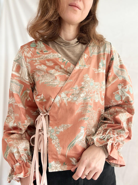 Rework Tie Front Blouse; Asian Print One of A Kind Wrap Top