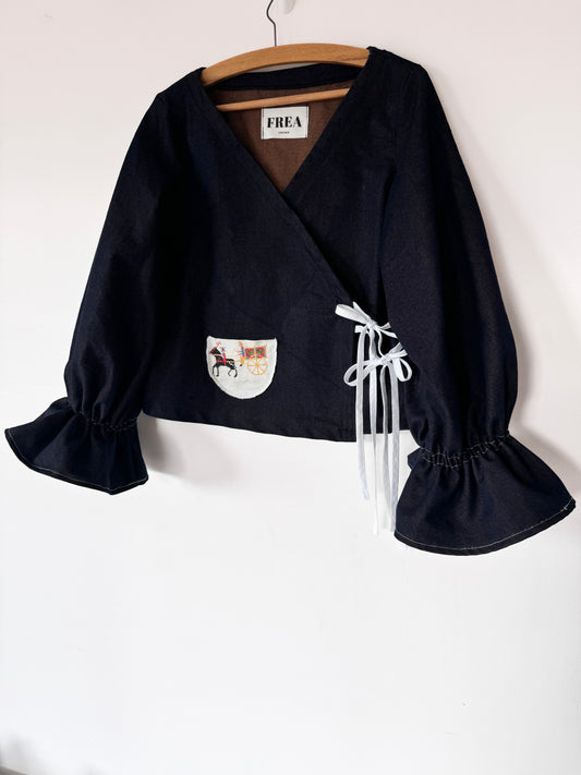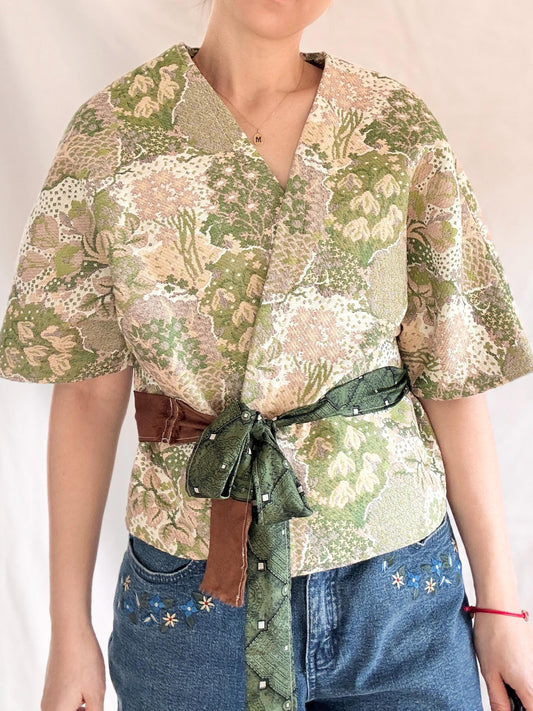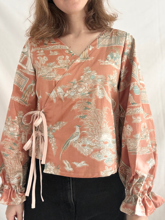 Rework Tie Front Blouse; Asian Print One of A Kind Wrap Top