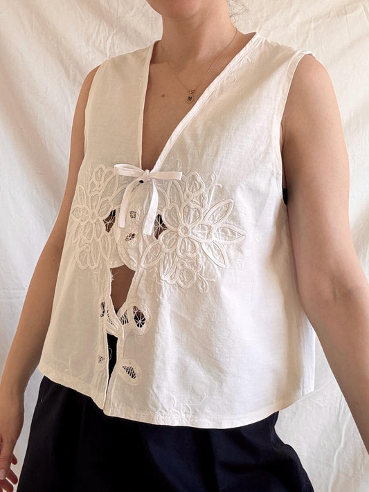 Reworked White Vest Top; Cotton Embroidered Blouse