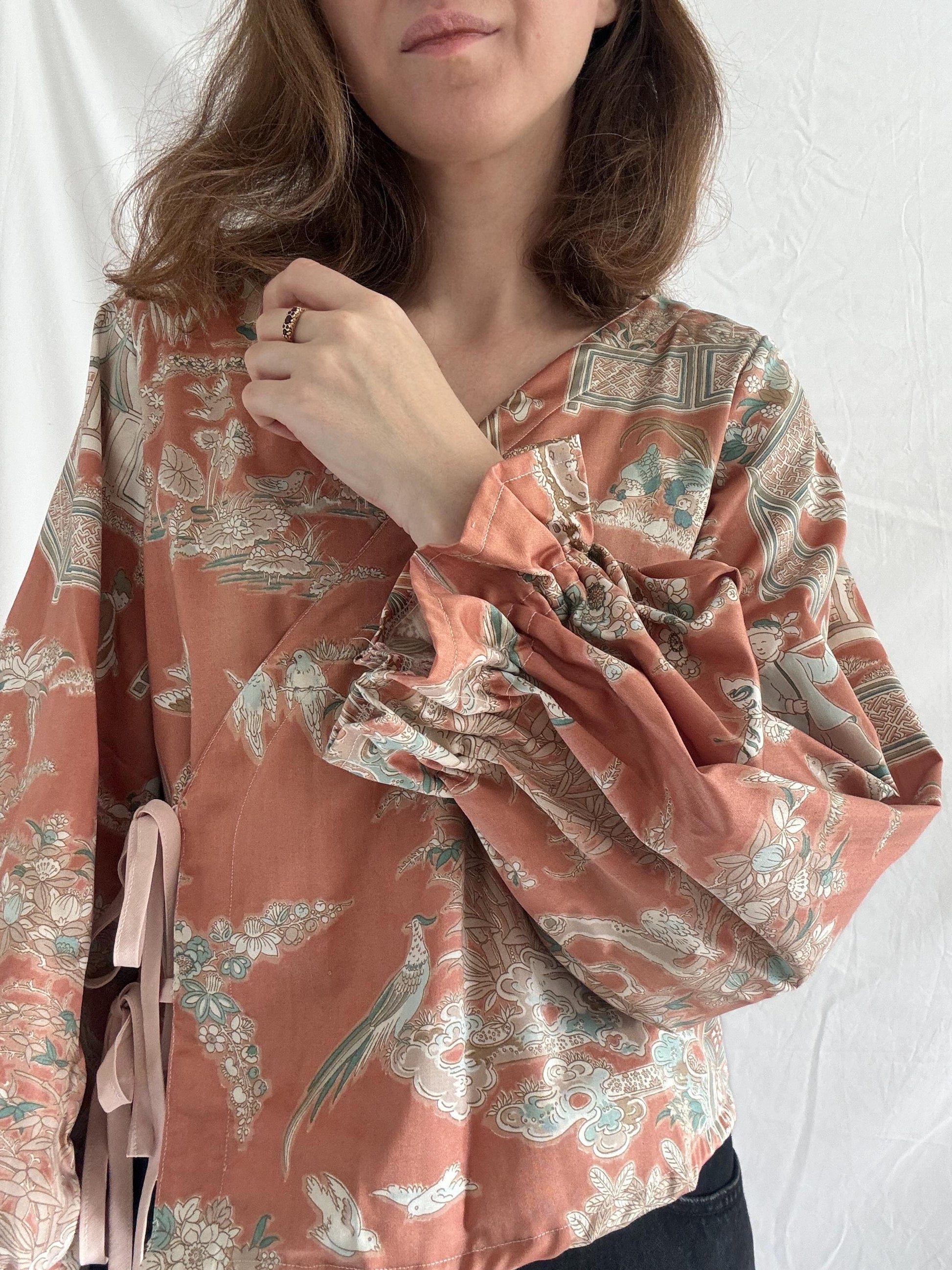 Rework Tie Front Blouse; Asian Print One of A Kind Wrap Top