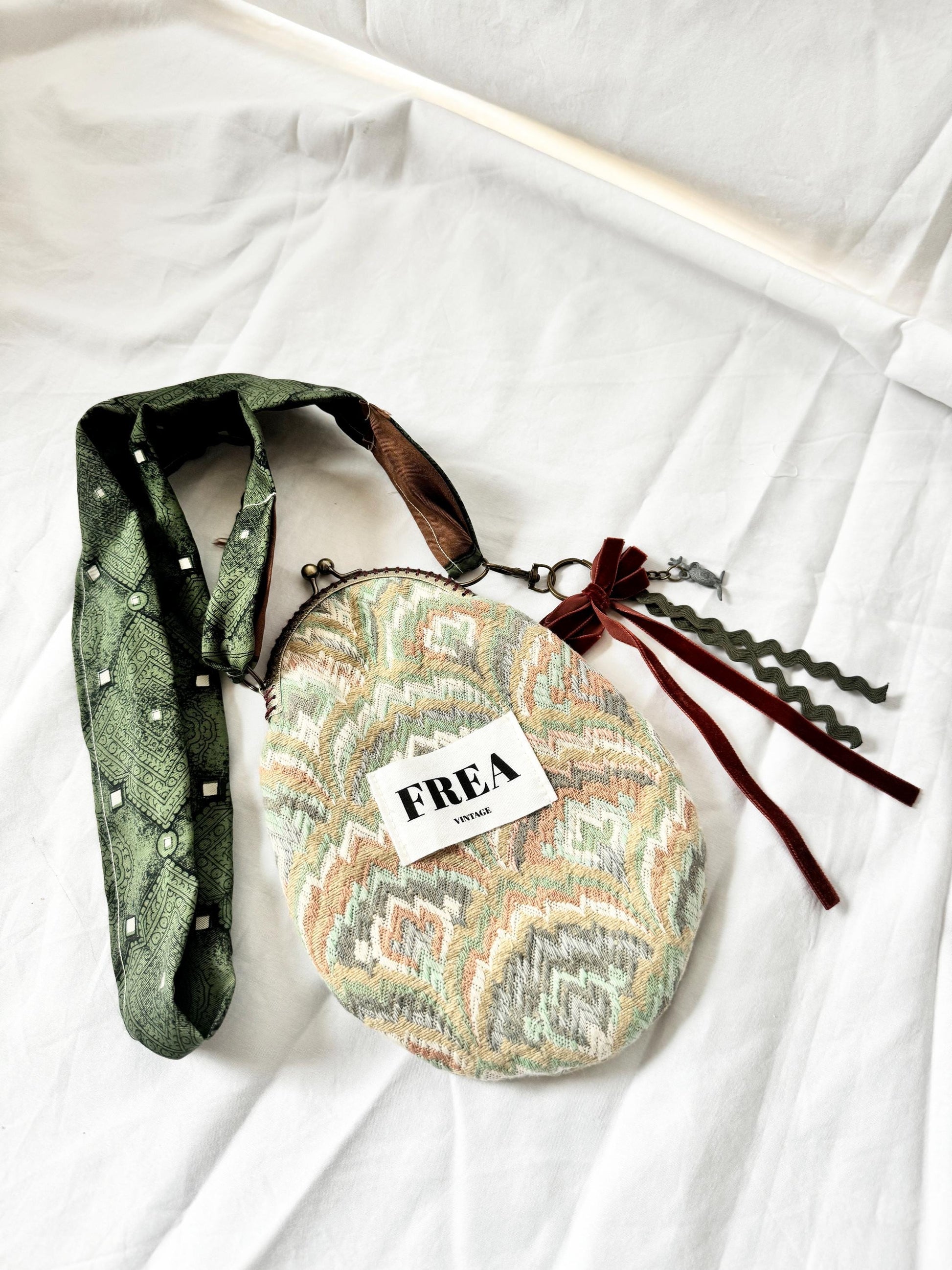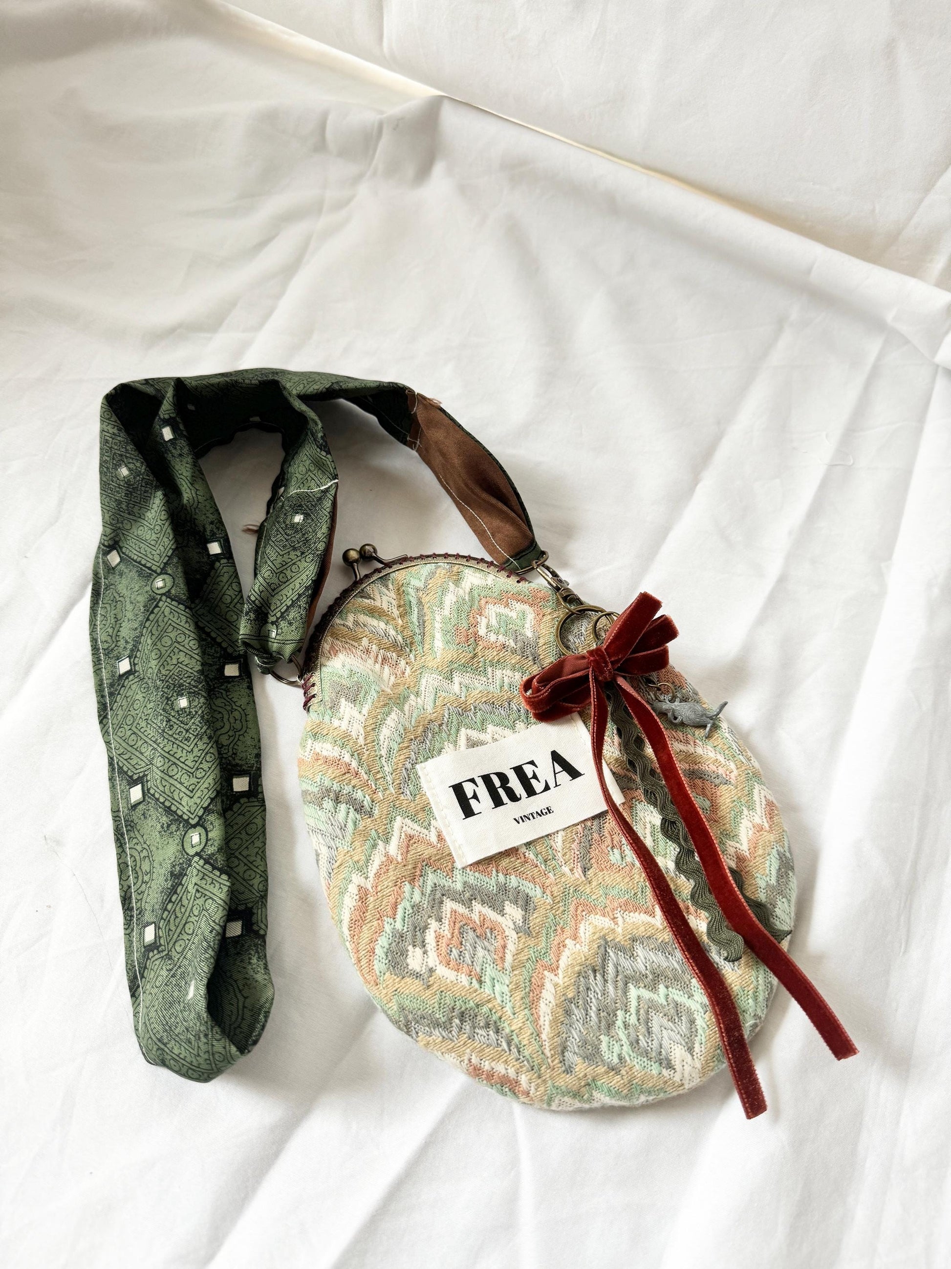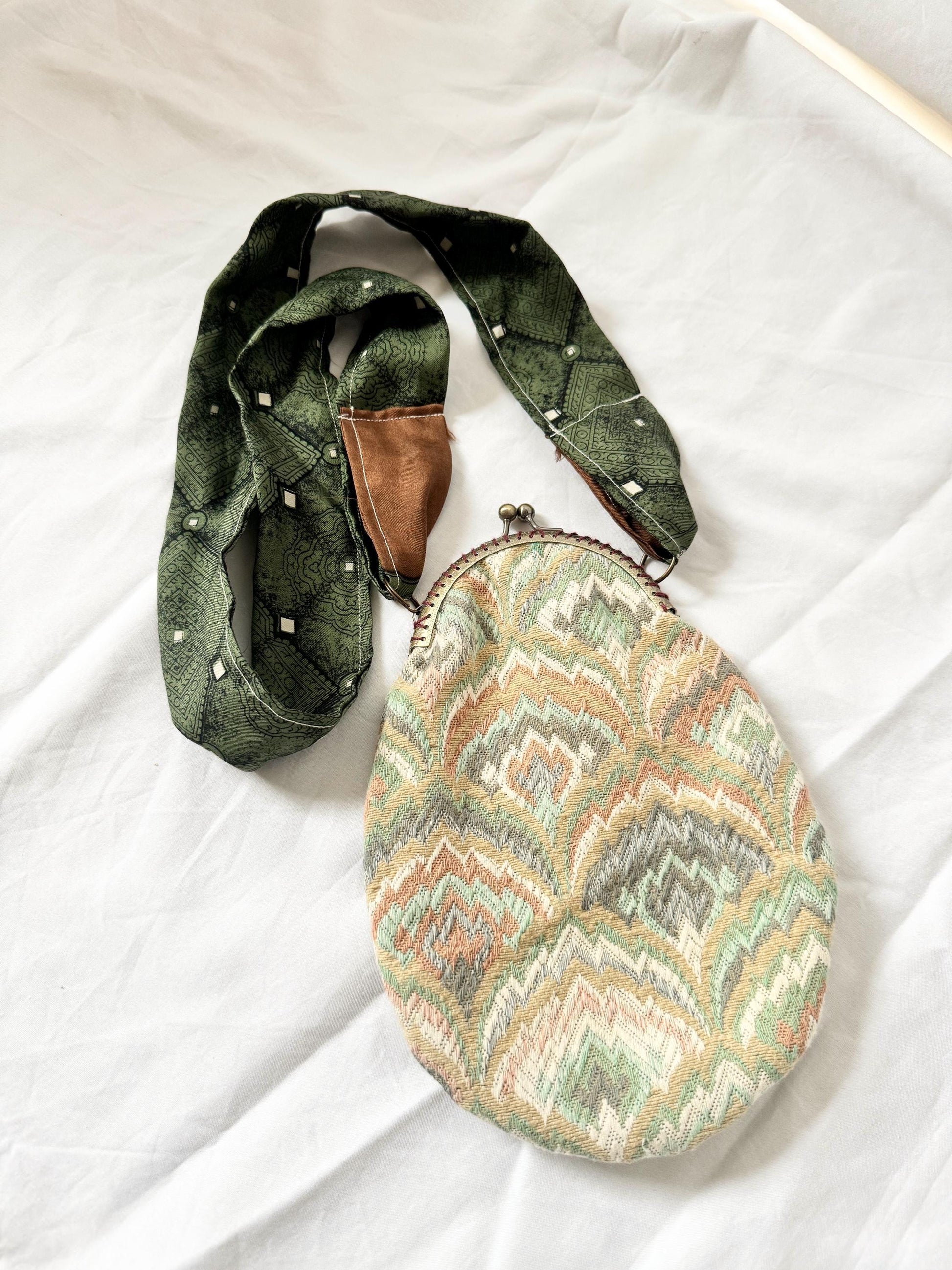 Made from vintage fabric mixed with removable vintage men's scarf as a strap