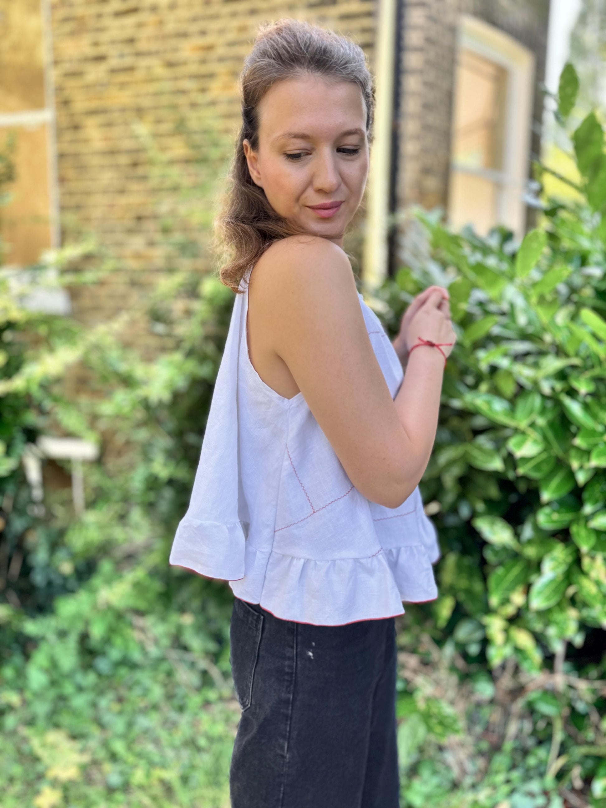 Upcycled Linen Tank with Elegant Halter Neck and Embroidered Accents