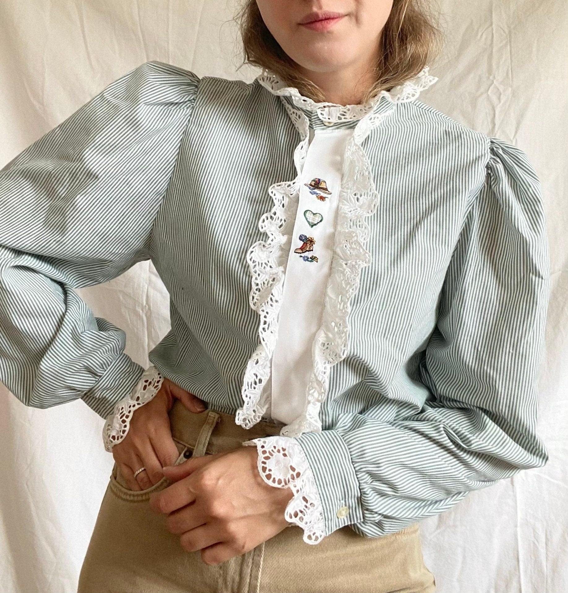 Vintage Hungarian Blouse; Embroidered Romantic Blue Blouse; Striped Green Blouse